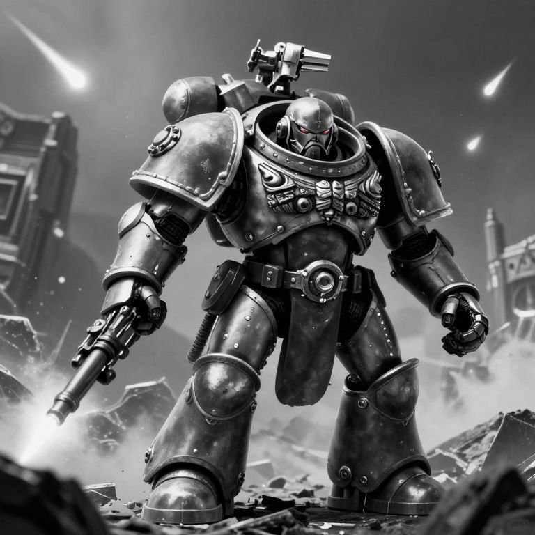 Monochrome digital art of a heavily armored, futuristic mecha warrior with a gun, standing amidst rubble with explosive light in the background.