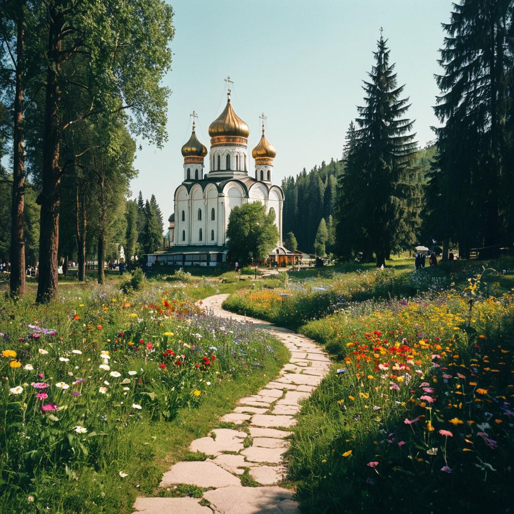 A vibrant small meadow filled with colorful flowers and greenery in the center of a futuristic town. People are walking and picnicking along a stone path leading towards towering glass buildings with a cyberpunk aesthetic. The scene combines natural elements and modern architecture, framed by dense trees and bright sunny weather.