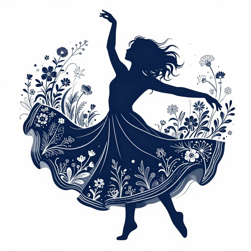 Artistic silhouette of a spirited female dancer in a flowing dress with intricate white line details. The figure is surrounded by swirling floral and wildflower patterns emphasizing movement and grace. The dancer's tousled hair and fluid pose convey energy and zest, rendered in a dark blue and white color scheme on a white background.