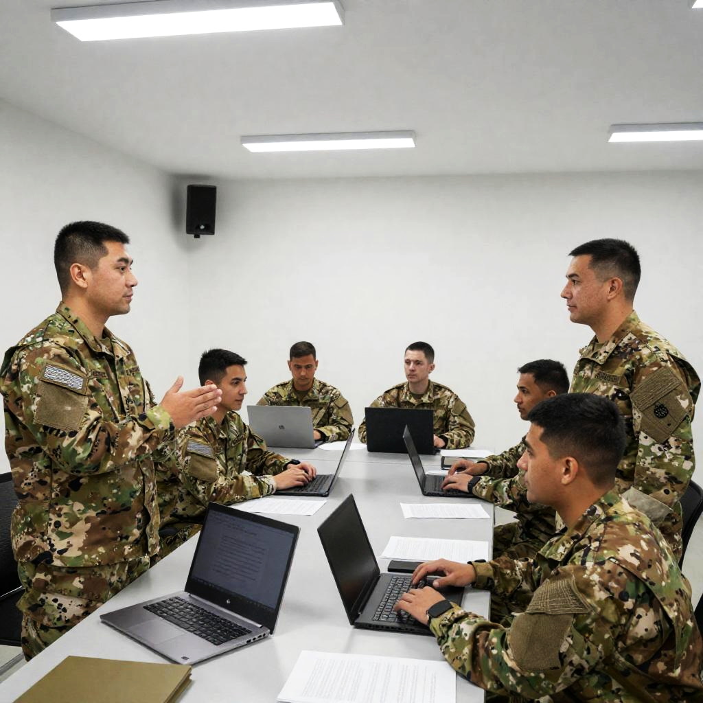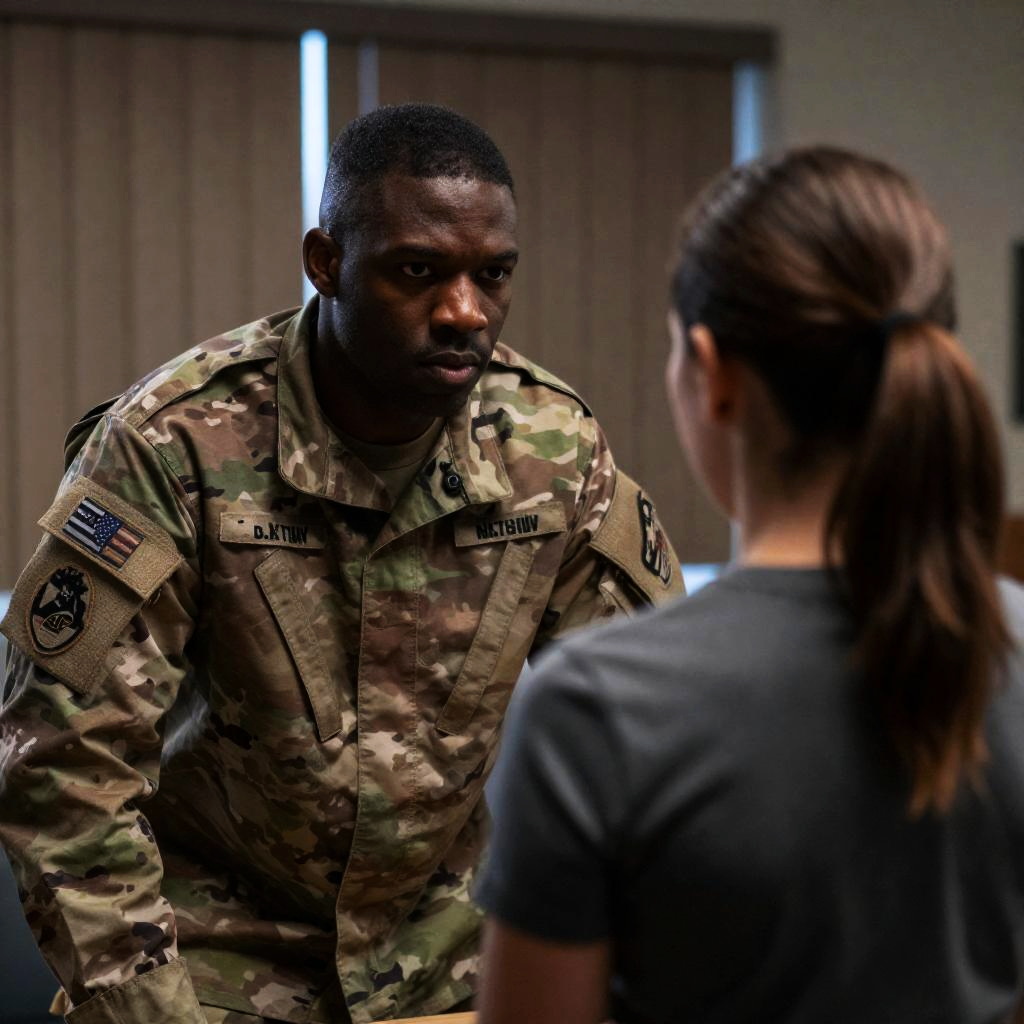 Photograph of a medical room. Nurse with brown hair, wearing green scrubs and a mask, attends to a patient with brown hair lying down. Two military personnel in camouflage uniforms stand in the background. Nurse's left hand wears a white glove. Nurse looks focused, patient relaxed.
