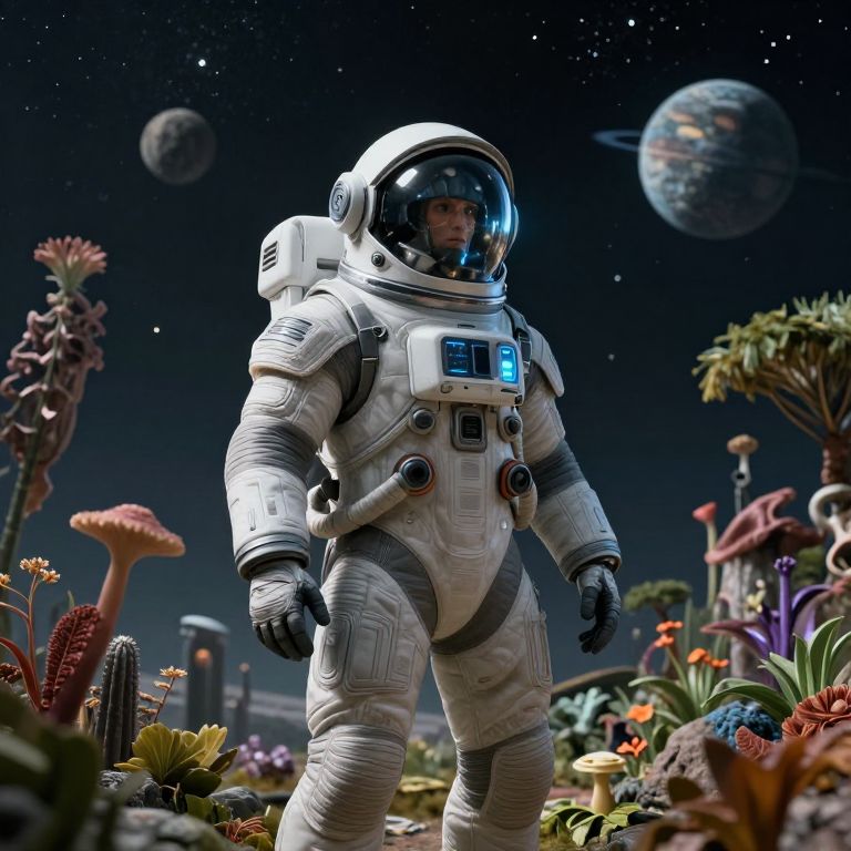 Photorealistic CGI of a white-suited astronaut with a glowing blue chest panel standing in a vibrant, alien planet garden with colorful flora and distant planetary