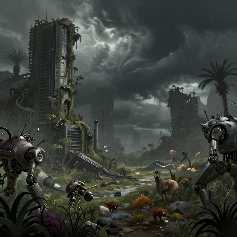Digital art of a dark, post-apocalyptic landscape with overgrown ruins, robotic creatures, wild animals, and stormy skies, blending sci-fi and