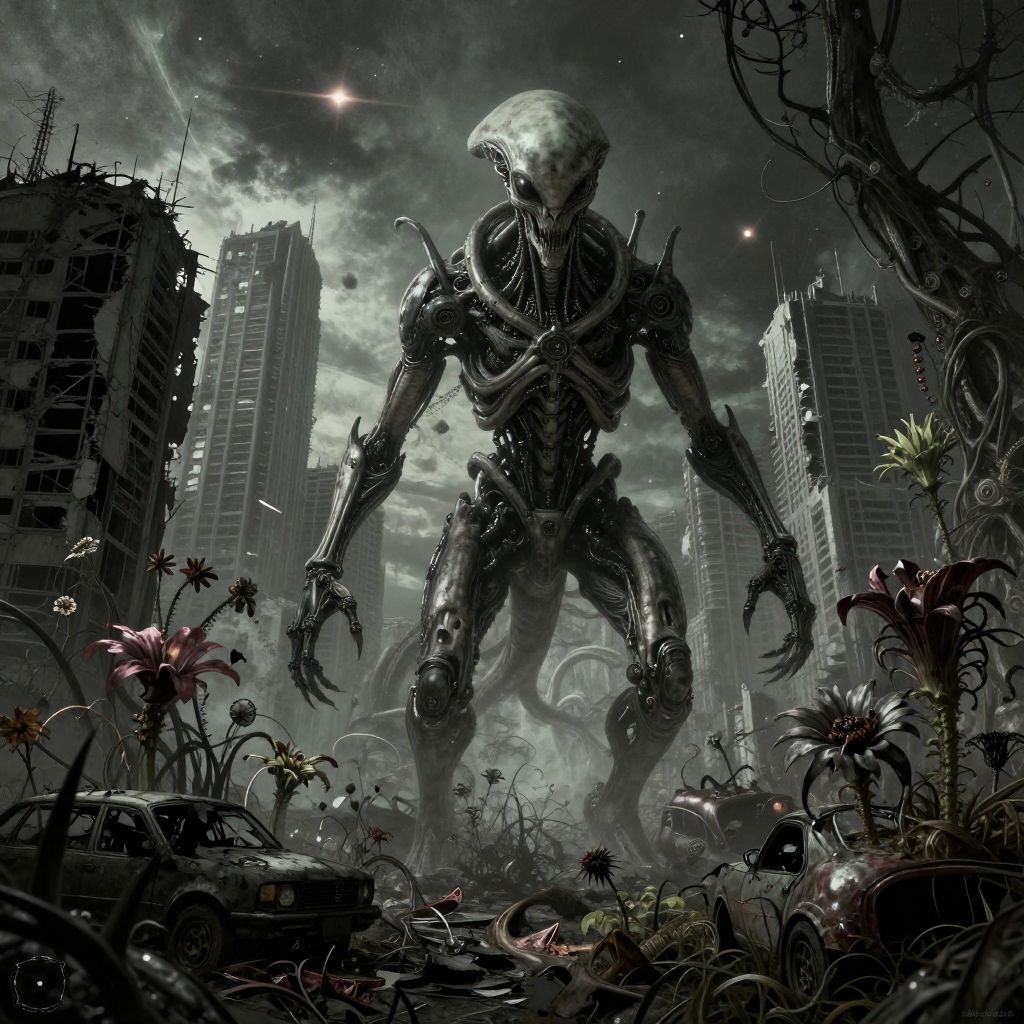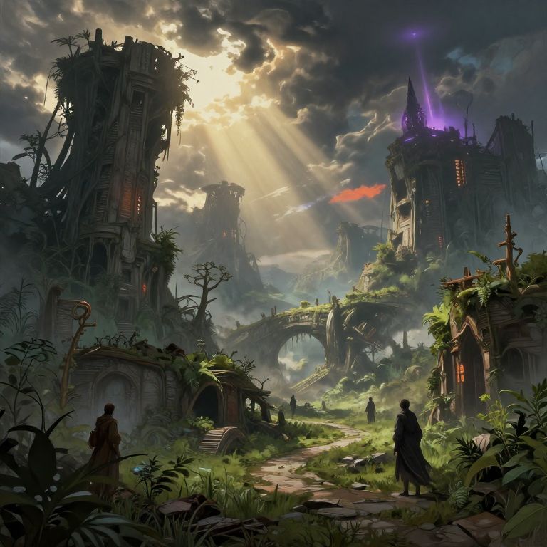 Fictional world generator illustration, dystopian post-apocalyptic landscape with ruined cities overgrown by mutated plants, dark stormy skies, robotic remnants mingling with wild animals, detailed atmospheric perspective, moody cyberpunk undertones
