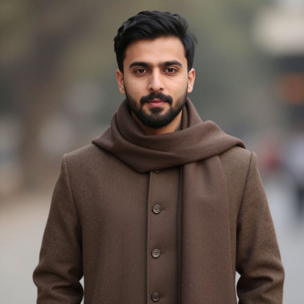 Photograph of a handsome, bearded South Asian man with dark hair, wearing a brown wool coat and matching scarf, standing outdoors with a blurred,