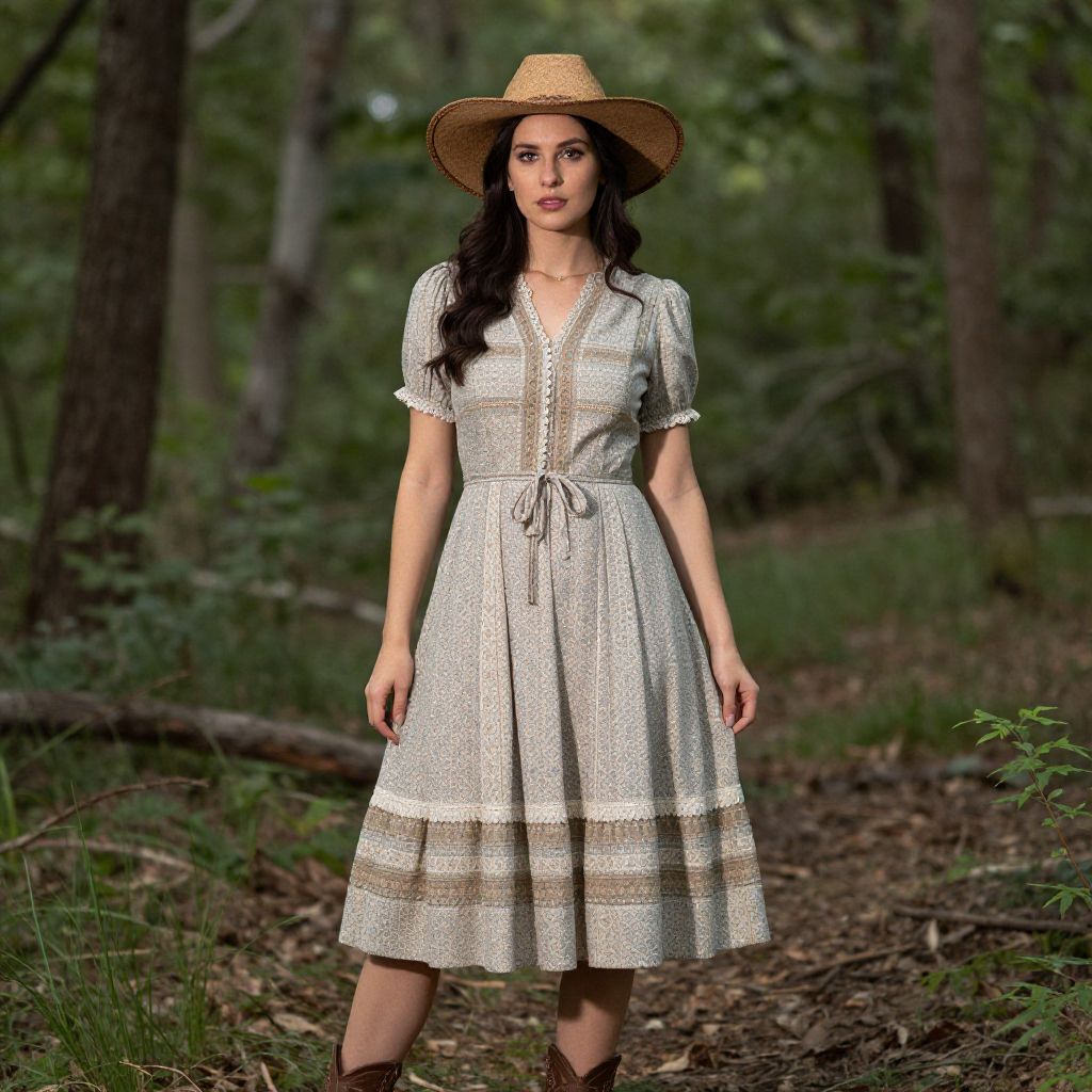 "Woman Country Clothing Costume, woman in a dress and a hat standing in the woods"