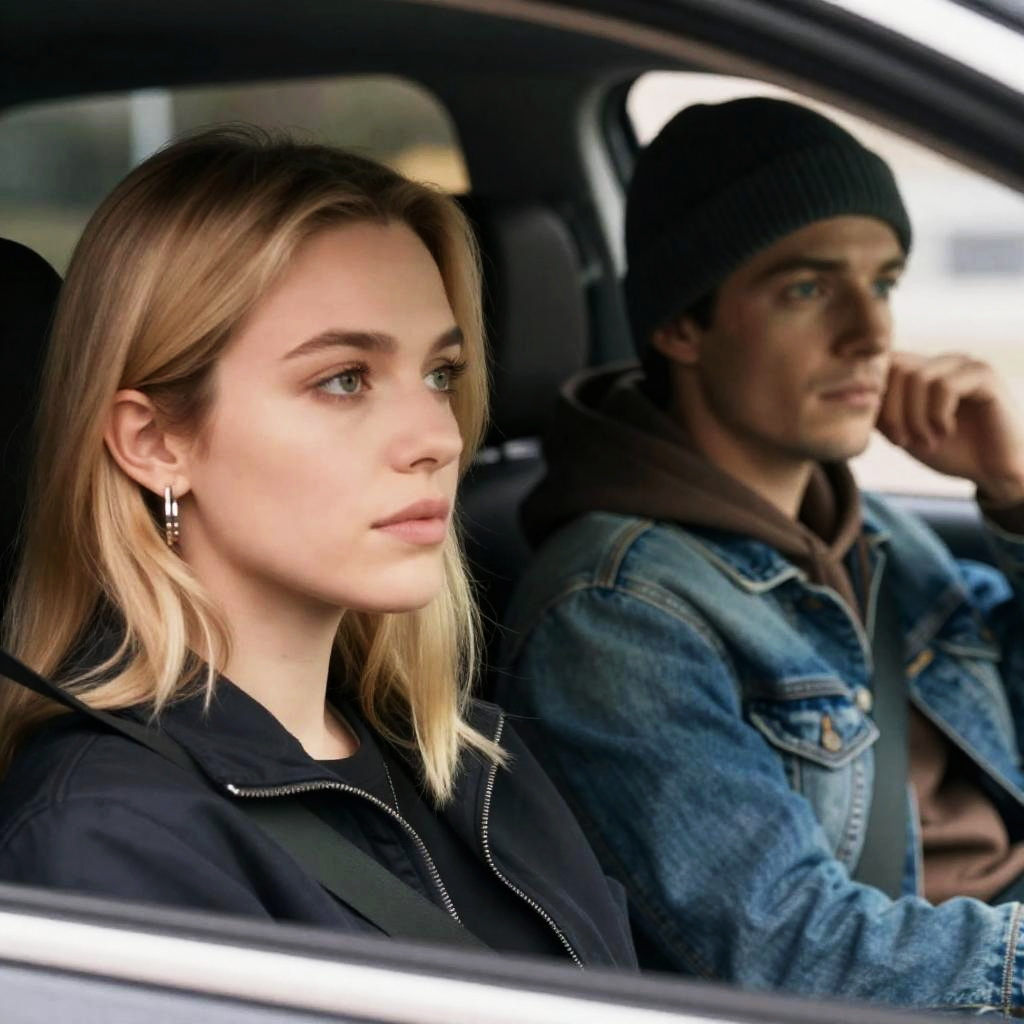 Photograph of two people in a vehicle's backseat. Blonde woman with loose hair, light skin, floral top, serious expression. Man with short brown hair, light skin, white shirt, turquoise necklace, slight smile. Sunlight through window, vehicle interior.