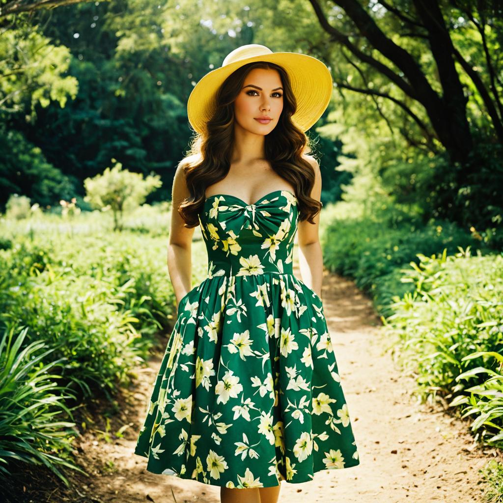 Old hollywood fancy dress, photograph of a beautiful young woman, long wavy brown hair, wearing a green floral dress with a strapless sweetheart neckline, full skirt, light yellow wide-brimmed hat, standing on a dirt path in a lush, green garden, sunny day, dappled sunlight, trees and plants in background, natural light, elegant and vintage style, portrait orientation, realistic, high detail, soft colors, relaxed and serene atmosphere
