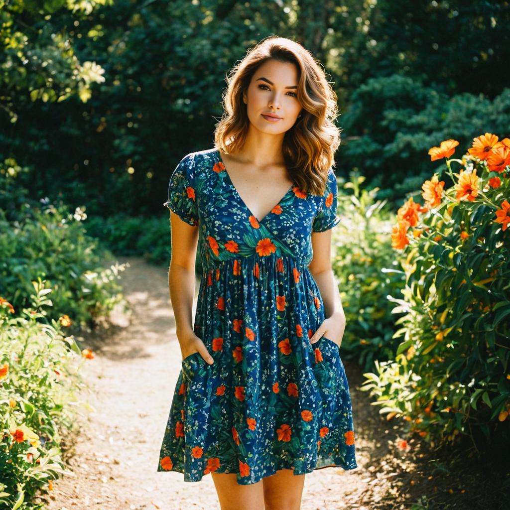 Portrait of a beautiful young woman with long wavy brown hair wearing a green floral strapless dress with a sweetheart neckline and a full skirt. She is also wearing a light yellow wide-brimmed hat while standing on a dirt path surrounded by lush green plants and trees. The image is taken outdoors in a sunlit garden with dappled natural light, evoking an elegant, vintage, and serene atmosphere.