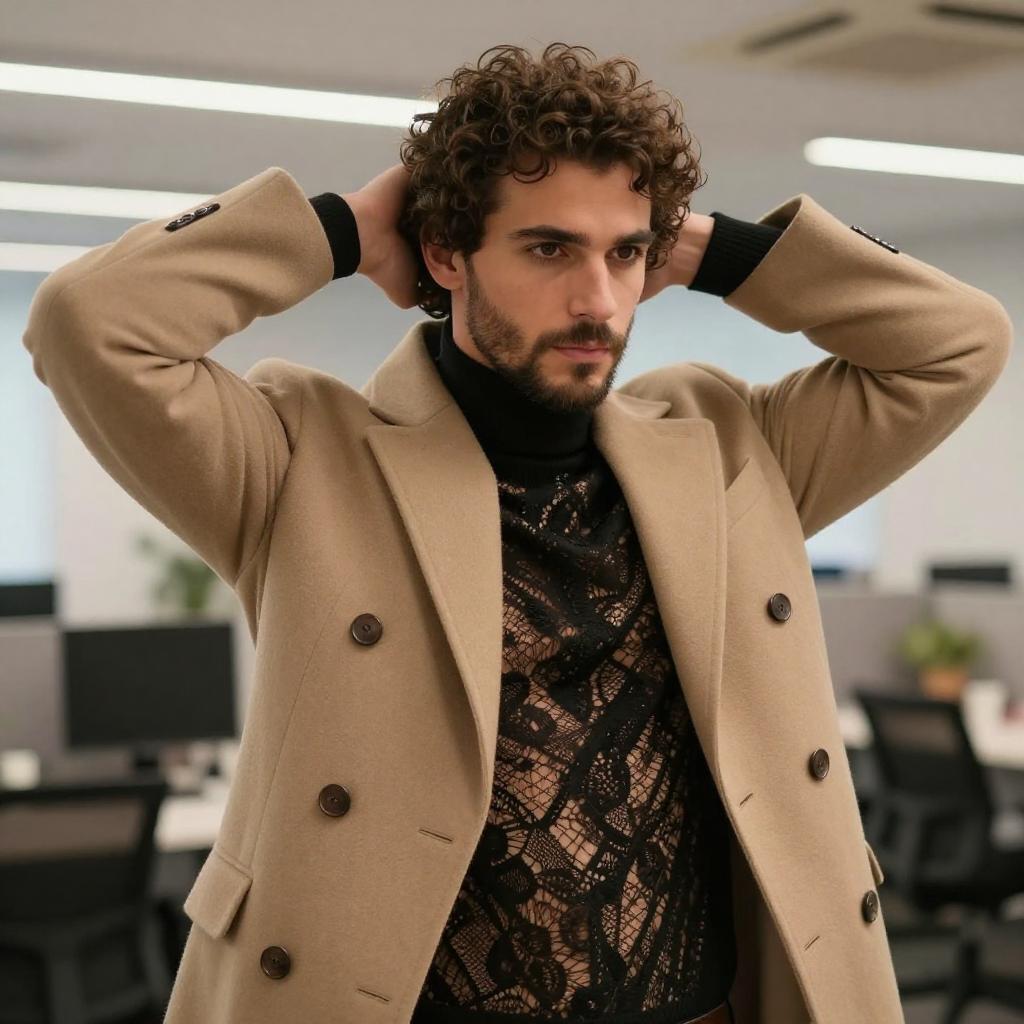 Photograph of a handsome man with curly brown hair and a trimmed beard, standing indoors in a modern office space. He's wearing a beige double-breasted coat over a black lace turtleneck. His hands are behind his head, giving a confident, slightly serious look. The background is blurred, featuring office desks and fluorescent lights. His style is chic and modern.