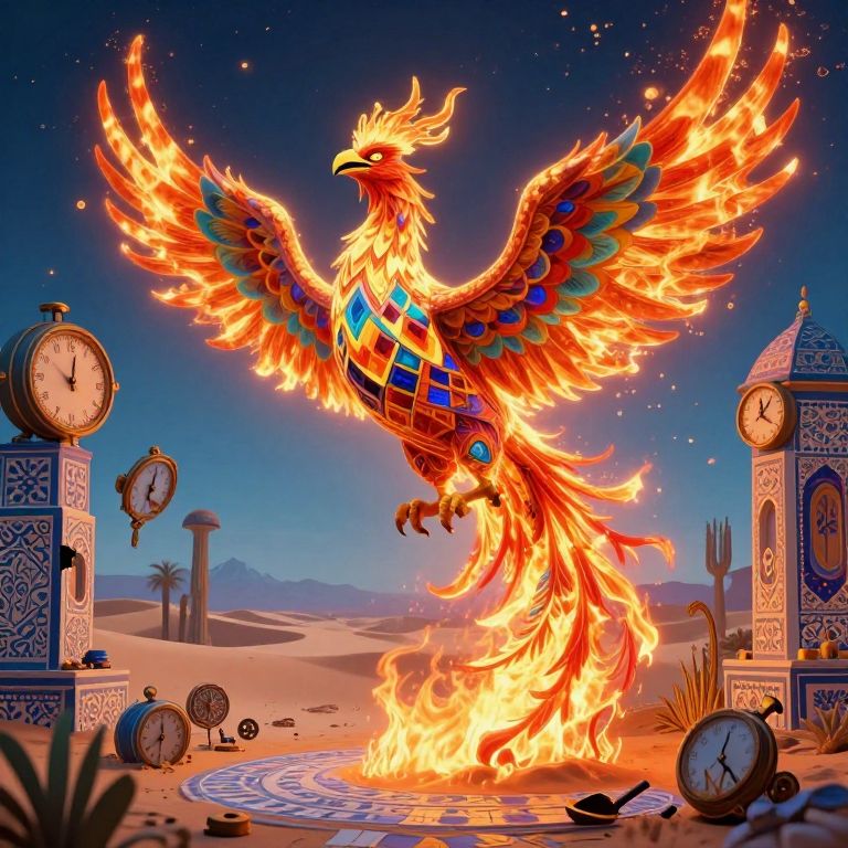 A surreal digital art composition depicting an antique tower morphing into a vast expanse of flowing, liquid-like time beneath an azure sky teeming with vibrant star constellations. From this malleable sea of moments, a majestic phoenix emerges, its fiery plumage reflecting the celestial chaos within its feathers. The bird ascends through a vortex created by the twisting, elongated hands of the clock, against a stark background featuring a surreal moonscape with looming shadows and peculiar architecture, evoking a sense of mystery and introspection as viewers contemplate the ephemeral nature of time and the cyclical journey of life.