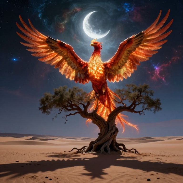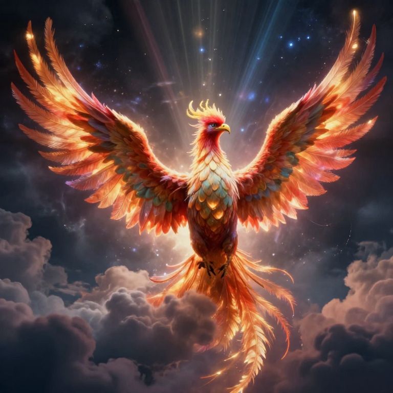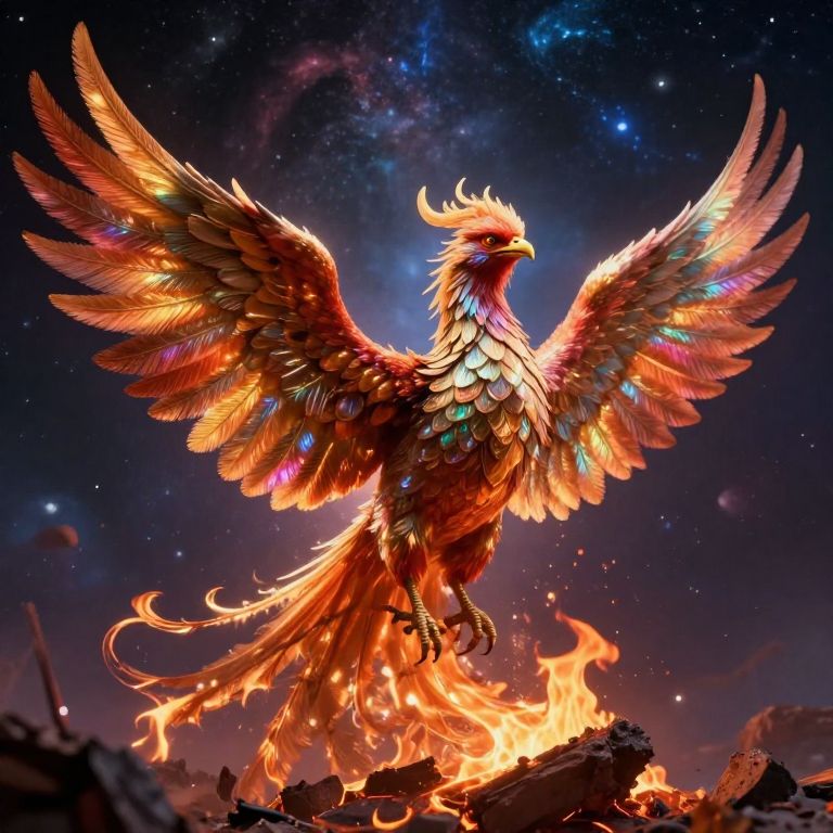 Digital art: A fiery phoenix with glowing wings perches on a clock tower in a starry night sky, surrounded by mystical planets and constellations