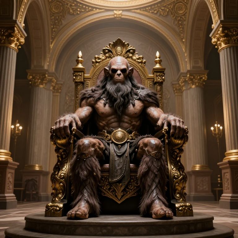 Digital artwork depicting a muscular, humanoid figure with a bald head, long black beard, and pointed ears, seated on an ornate, gold throne. The figure's skin is dark, and he has fur-covered legs and arms. He wears a metallic loincloth with intricate designs and a large circular pendant at the front. The throne has candle-like holders on either side. The background features grand, arched ceilings with golden accents and tall, fluted columns, giving a regal, ancient temple-like ambiance. The lighting is dramatic, highlighting the figure's muscular physique and the throne's elaborate design.