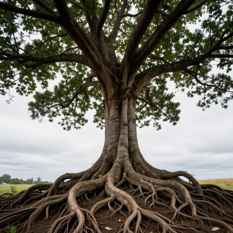 Roots cascade like whispers of resilience, anchoring the tree's soul to the earth while its branches reach skyward in a silent hymn of growth, embodying the eternal dance between grounding strength and soaring aspiration.