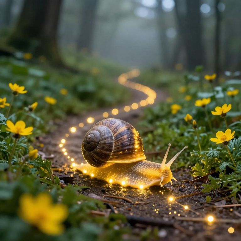 Glowing golden lights trace a winding path uphill as a large snail with a spiraled shell glides gracefully through a misty forest, surrounded by vibrant yellow flowers and lush green foliage.