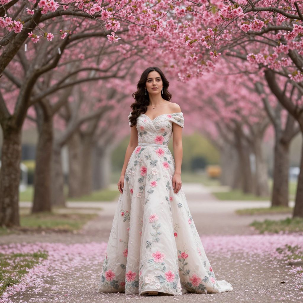 Photograph of a dark-haired woman in an off-shoulder white floral gown standing on a pink cherry blossom-lined path.
