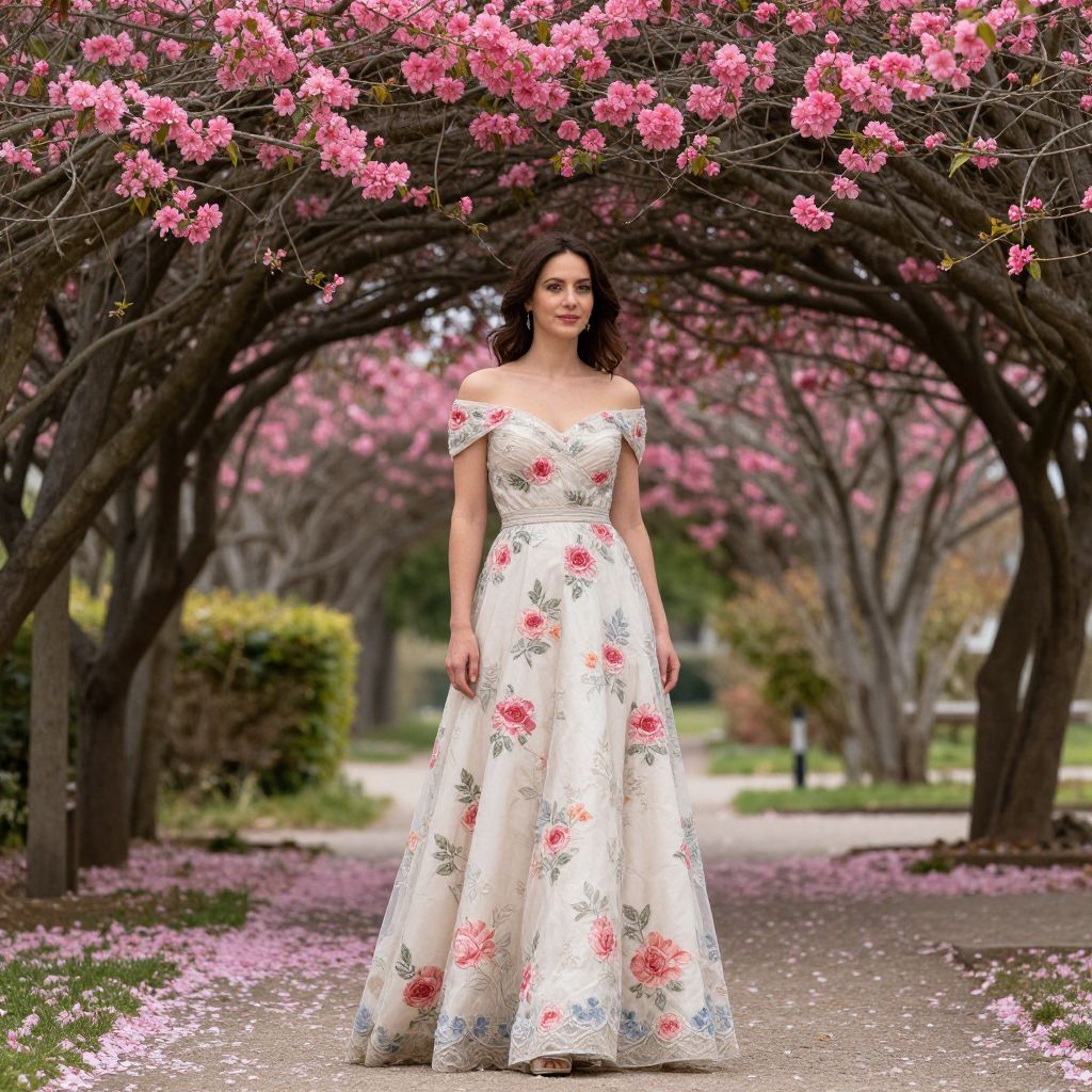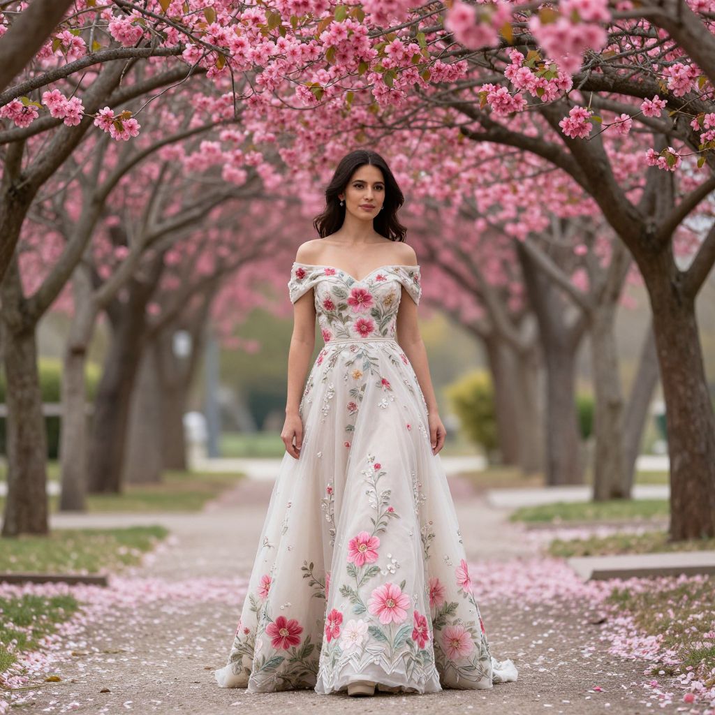 Elegant woman standing beneath a canopy of vibrant pink blossoms, her off-the-shoulder gown adorned with floral embroidery, surrounded by scattered petals on a serene garden path.