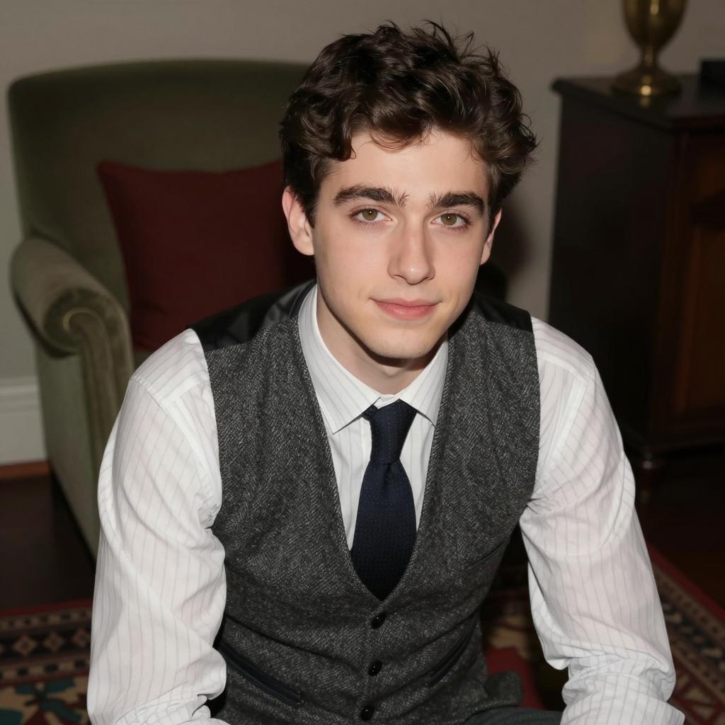 Black-and-white photograph of a young man with curly dark hair, wearing a formal suit, adjusting his bow tie with his right hand. Background includes blurred festive plant with large leaves. Man's expression is neutral, slightly introspective.