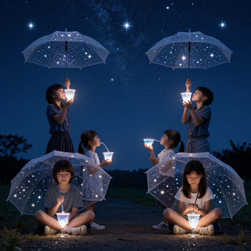 Children speak with the stars while hiding inside reverse umbrellas that open downward, sipping glowing comet syrup.