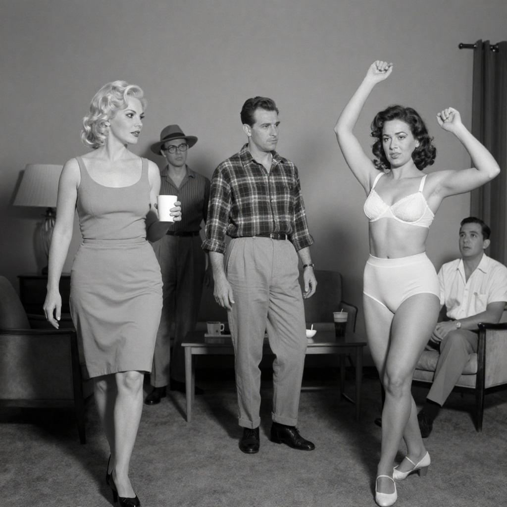 Black-and-white photograph of a mid-20th-century living room. Naked blonde woman with medium breasts walks left. Three men in casual clothes: one with a hat, holding a cup, center; one in a plaid shirt, right; one sitting in the background. Woman in underwear, right, dances. Furniture, chairs, and a table with a lamp in the background. Man with glasses in background watches. Intense expressions on some faces.