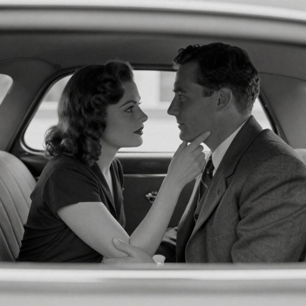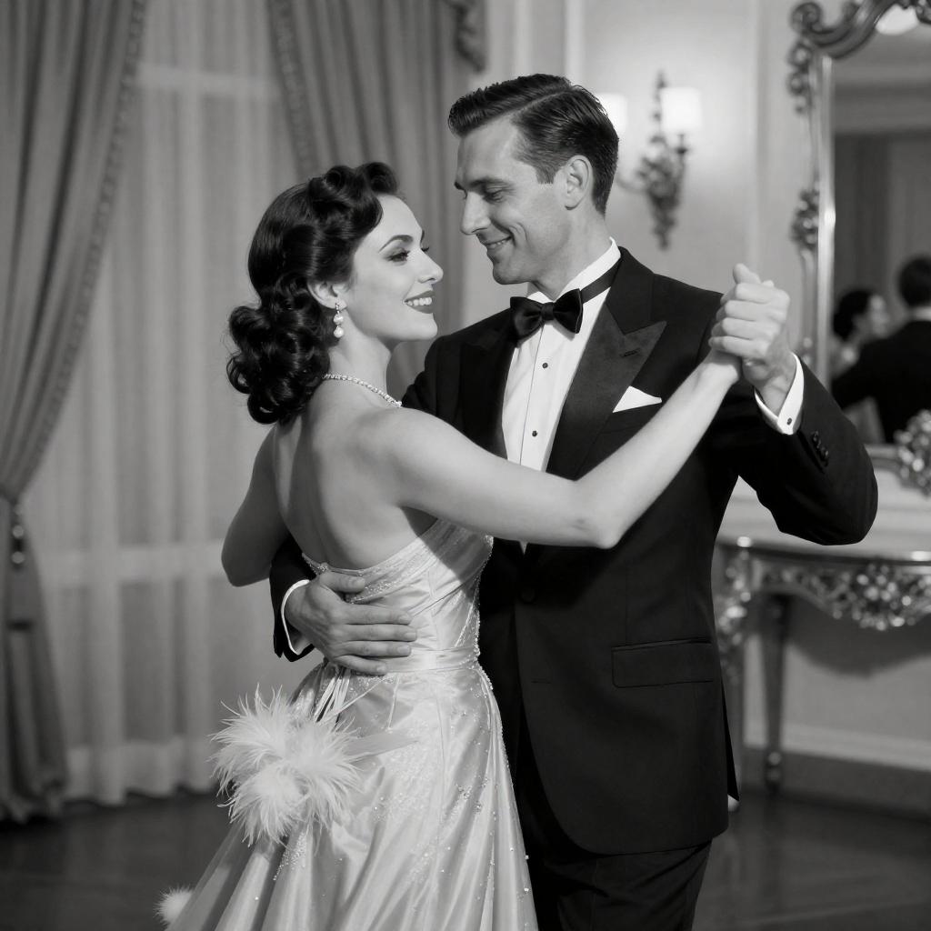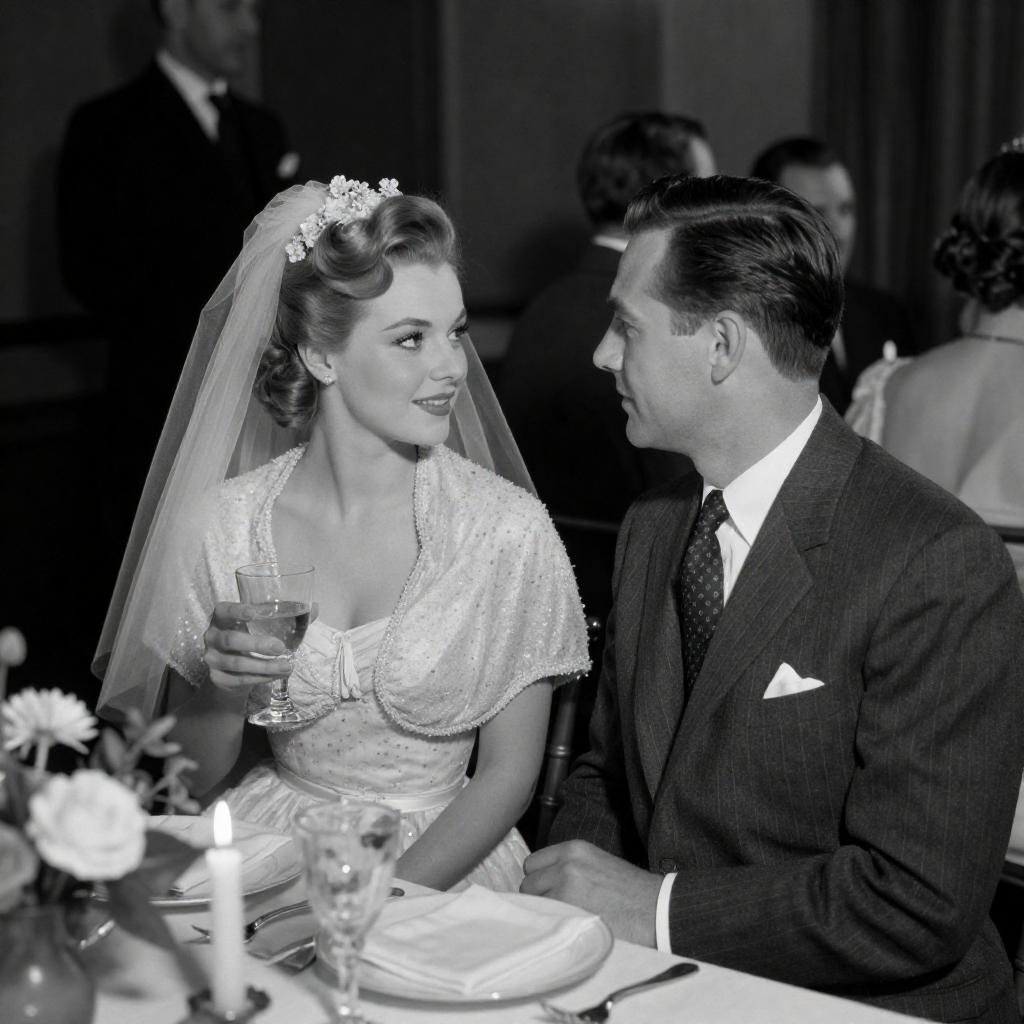 Sepia-toned photograph of a 1940s-style couple at an elegant Easter Parade. The woman, with a large, elaborate hat and a dark, ured dress, leans towards the man, who wears a dark suit and tie. They sit at a table with glasses and a bouquet. Background shows blurred, seated guests.
