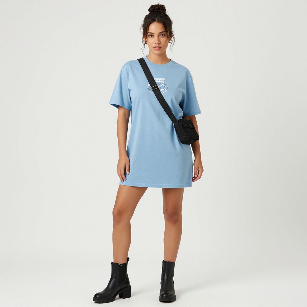 "Woman, casual streetwear, light blue t-shirt dress with short sleeves and a round neckline, featuring a small contrasting graphic print on the chest, a black crossbody bag with a thick strap, black ankle boots with a chunky heel, natural makeup, hairstyle in a messy bun, plain white studio background.. Sexy. Pretty face and beаutiful eyes. Big breasts."