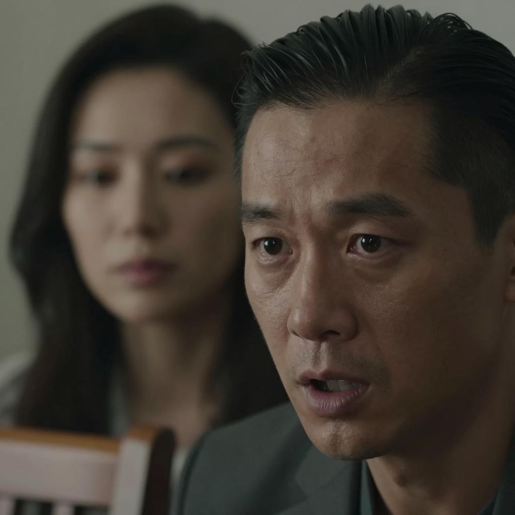 Photograph of a man with short dark hair, wearing a beige shirt, sitting at a dark outdoor table. He's smoking a cigarette, looking serious. Several bottles of liquor and a plate with snacks are on the table. Two other partially visible men are on the left, one with a white shirt. Nighttime background with dark trees.