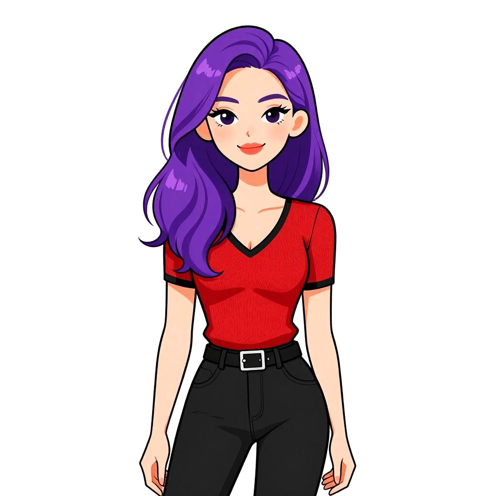 Digital drawing of a young woman with vibrant purple hair and fair skin, standing against a white background. She wears a black short-sleeve dress with a white collar and a small logo on the left chest, yellow knee-high socks, and black-and-white sneakers. Her large hoop earrings and confident smile add a playful touch. The art style is colorful and cartoonish, with bold outlines and flat colors, reminiscent of anime or comic art. The woman's posture is relaxed, with her arms slightly away from her body and feet shoulder-width apart.