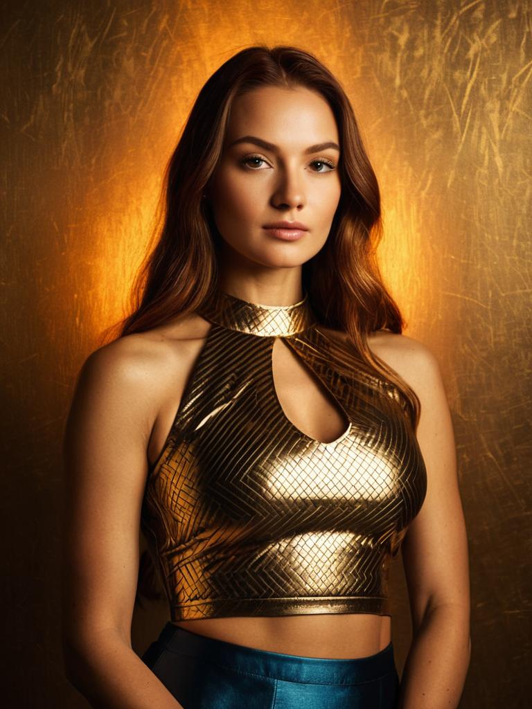 Portrait of a woman with long brown hair wearing a metallic gold halterneck crop top with a textured pattern and a keyhole cut-out detail. She is posing against a warm, golden textured background. The focus is on upper body fashion and style.