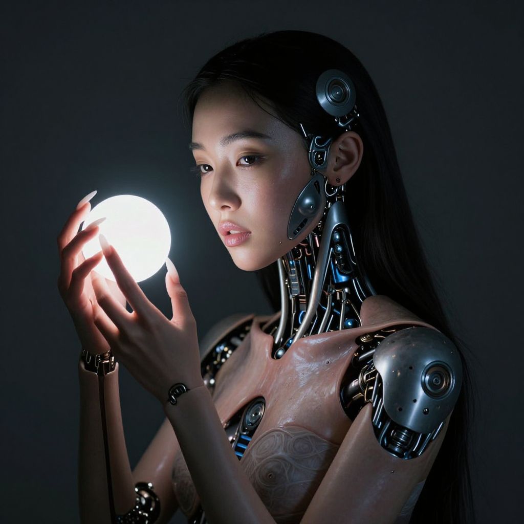 Photorealistic digital artwork of a young woman with long black hair and light brown skin, wearing a shiny silver jacket with intricate patterns, facing a white humanoid robot against a black background. The woman's expression is calm and focused, while the robot's face is expressionless. The robot's head is spherical with visible joints and circuitry, and it has a sleek, metallic body. The woman's left side is shown, while the robot faces her right. The lighting emphasizes the textures of the jacket and the robot's metallic surface. The image conveys a sense of connection or contemplation between human and machine.