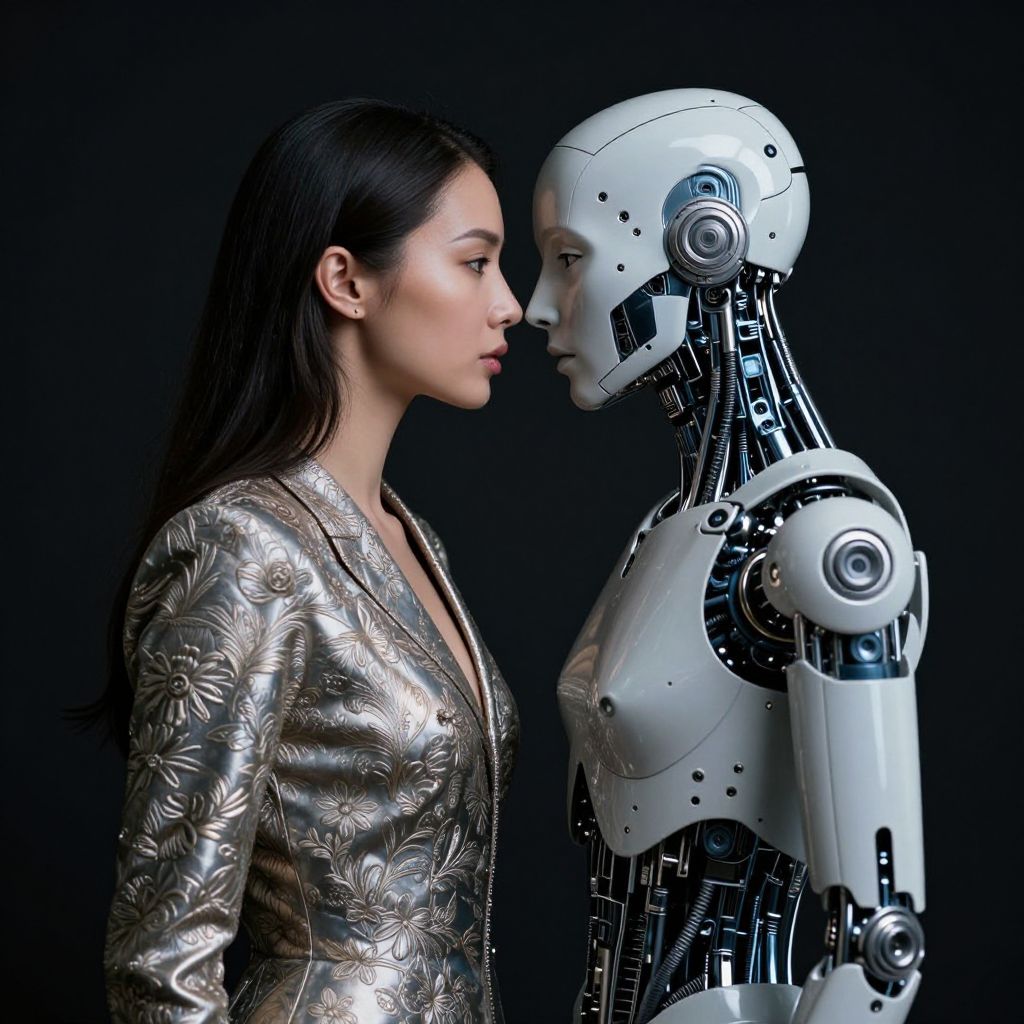 In this captivating image, two figures stand in close proximity, their faces almost touching, creating an intimate and almost surreal moment. The figure on the left is a human, adorned in a sleek, metallic suit with intricate floral patterns, exuding a sense of elegance and strength. The figure on the right is a cyborg, with exposed printed circuits and mechanical components, embodying a blend of organic and technological elements. Both figures are positioned centrally, their heads aligned, suggesting a connection between the human and the machine. The background is a deep, dark hue, which contrasts sharply with the figures, highlighting their forms and the intricate details of their attire and mechanical parts. The overall composition is balanced, with the human figure on the left and the cyborg on the right, creating a harmonious visual equilibrium. The image evokes themes of artificial intelligence, the intersection of human and machine, and the complex relationship between technology and humanity.