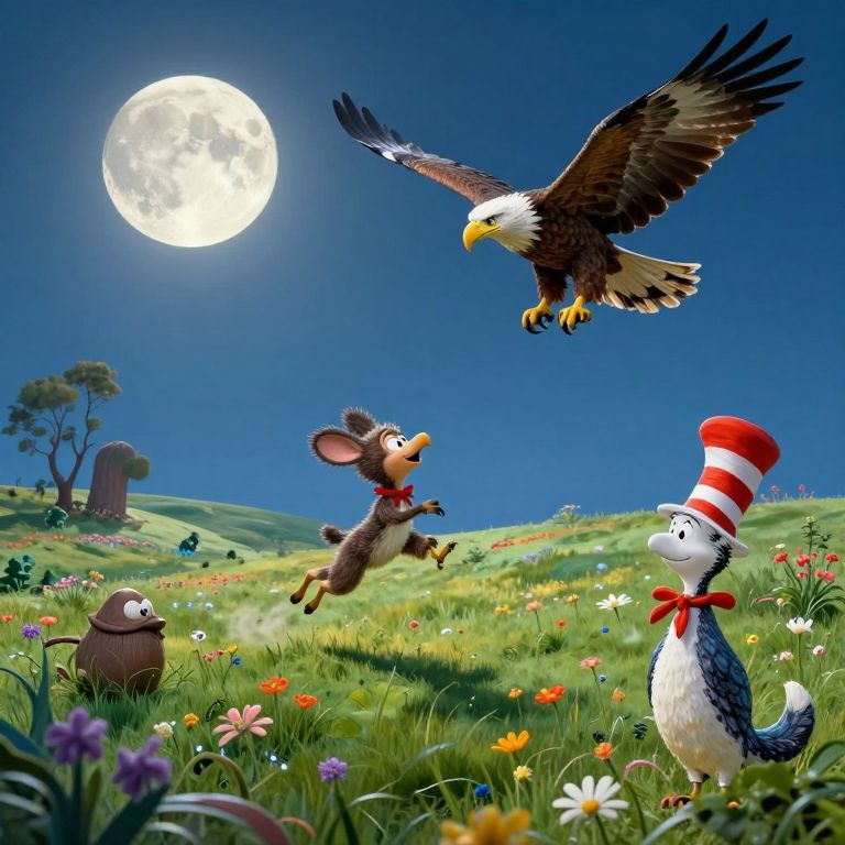 Imagine a dreamlike landscape where a playful creature leaps across an ethereal meadow bathed in moonlight, as seen from the vantage point of a soaring eagle. The vivid palette and whimsical characters create a sense of enchantment, inviting viewers to explore the unexpected fusion of wonder and mystery. This surreal scene, reminiscent of both Dali's dreamscapes and Seuss's imaginative worlds, encourages an exploration of fantastical elements while maintaining a playful atmosphere.