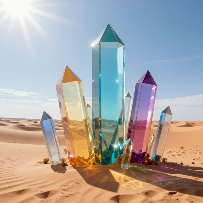 In a surreal desert landscape, towering glass prisms of vibrant hues stand like crystalline sentinels, refracting sunlight into shimmering beams that dance across the sand.