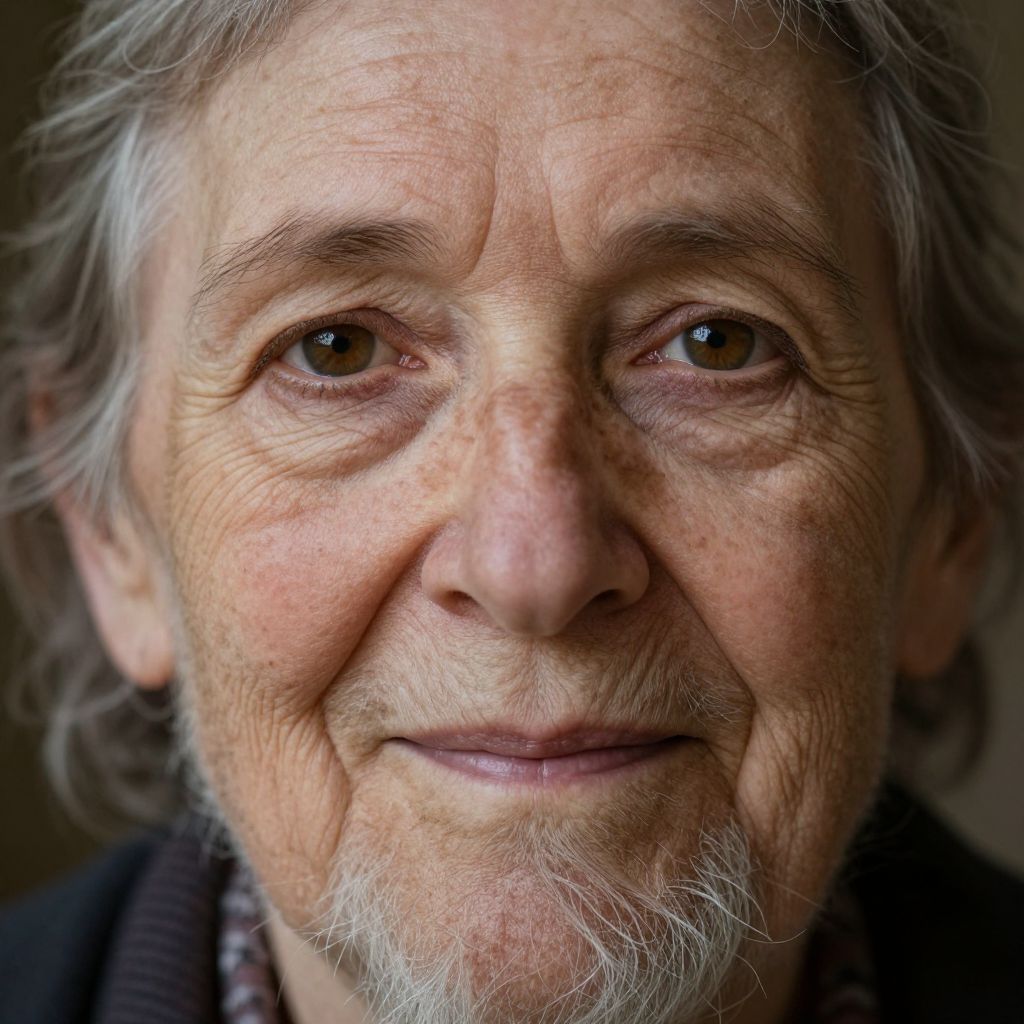 Craft a photorealistic portrait photograph of 'The Whispers,' an enigmatic elderly woman with a deeply wrinkled visage, each line a narrative thread. Her piercing eyes, centuries-old, are framed by bushy eyebrows and a thick white beard. Soft side lighting gently illuminates her weathered features, casting subtle shadows. Capture her gentle smile, hinting at both kindness and untold secrets. This intimate close-up should focus on her face's intricate details: lines, creases, and faint freckles across her skin.