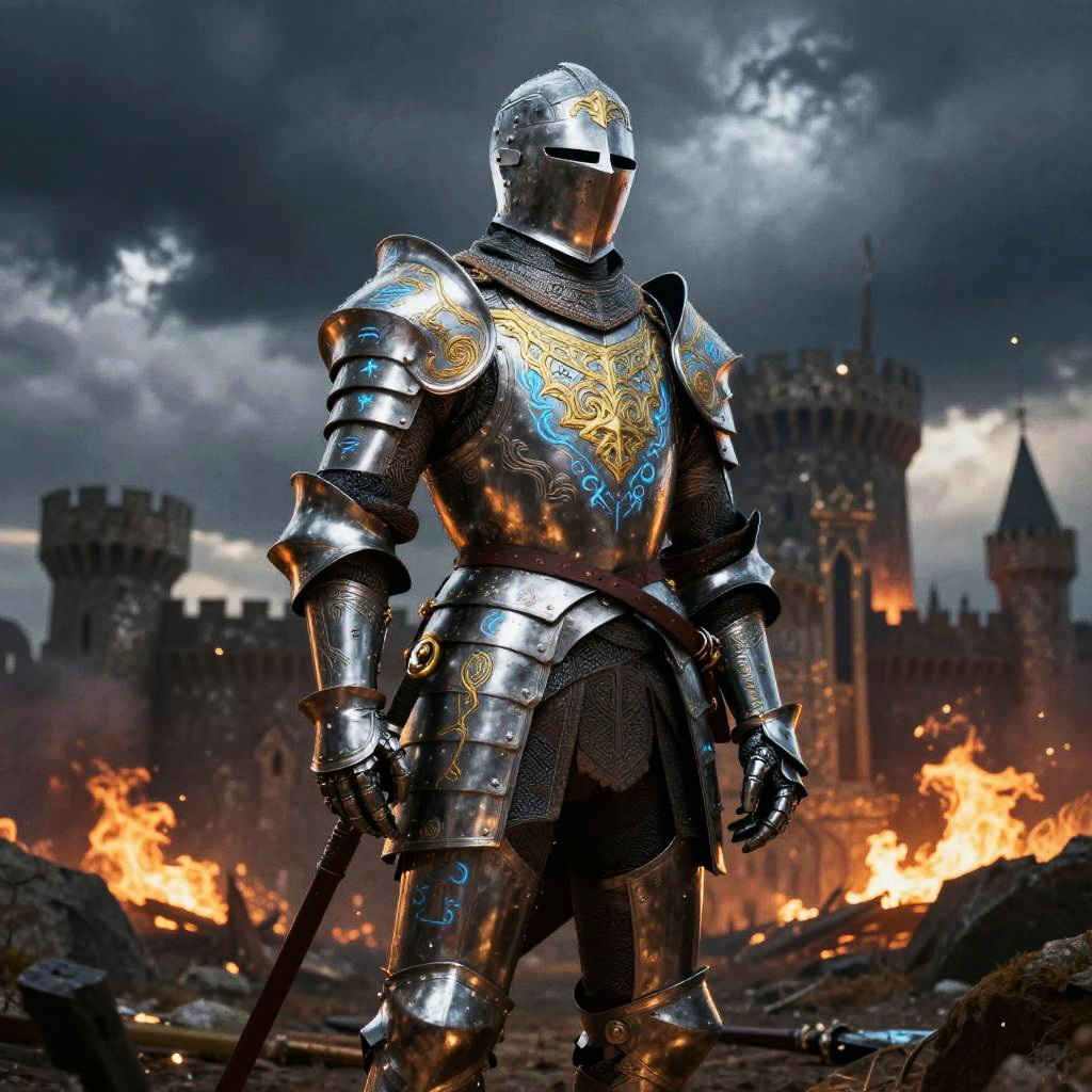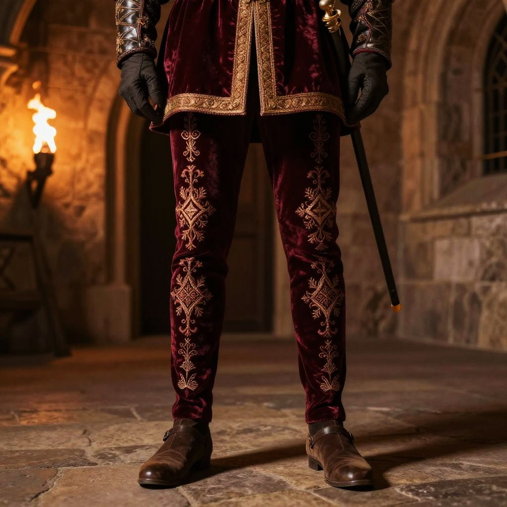 Medieval tights worn by a noble knight standing in a dimly lit stone castle hall, intricate embroidery, rich velvet fabric, warm torchlight casting shadows