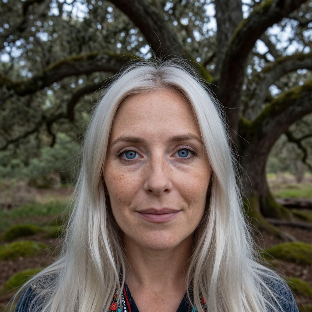 Envision a portrait photograph showcasing the captivating gaze of a Native American woman with piercing blue eyes and long, platinum hair illuminated by soft, ethereal light filtering through an ancient oak's gnarled branches. From a unique 'worm's-eye view', this close-up reveals intricate details like her delicate freckles and subtle smile while hinting at the lush, mossy forest floor beyond. The scene exudes mystique and serenity, blending classical portraiture allure with atmospheric enchantment.