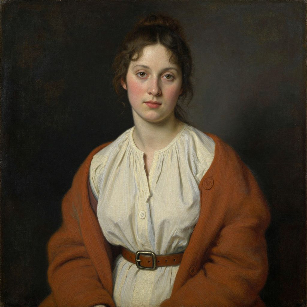 Photorealistic portrait of a young Caucasian woman with fair skin, long brown hair, and soft pink cheeks, wearing a lace collar, adorned with a