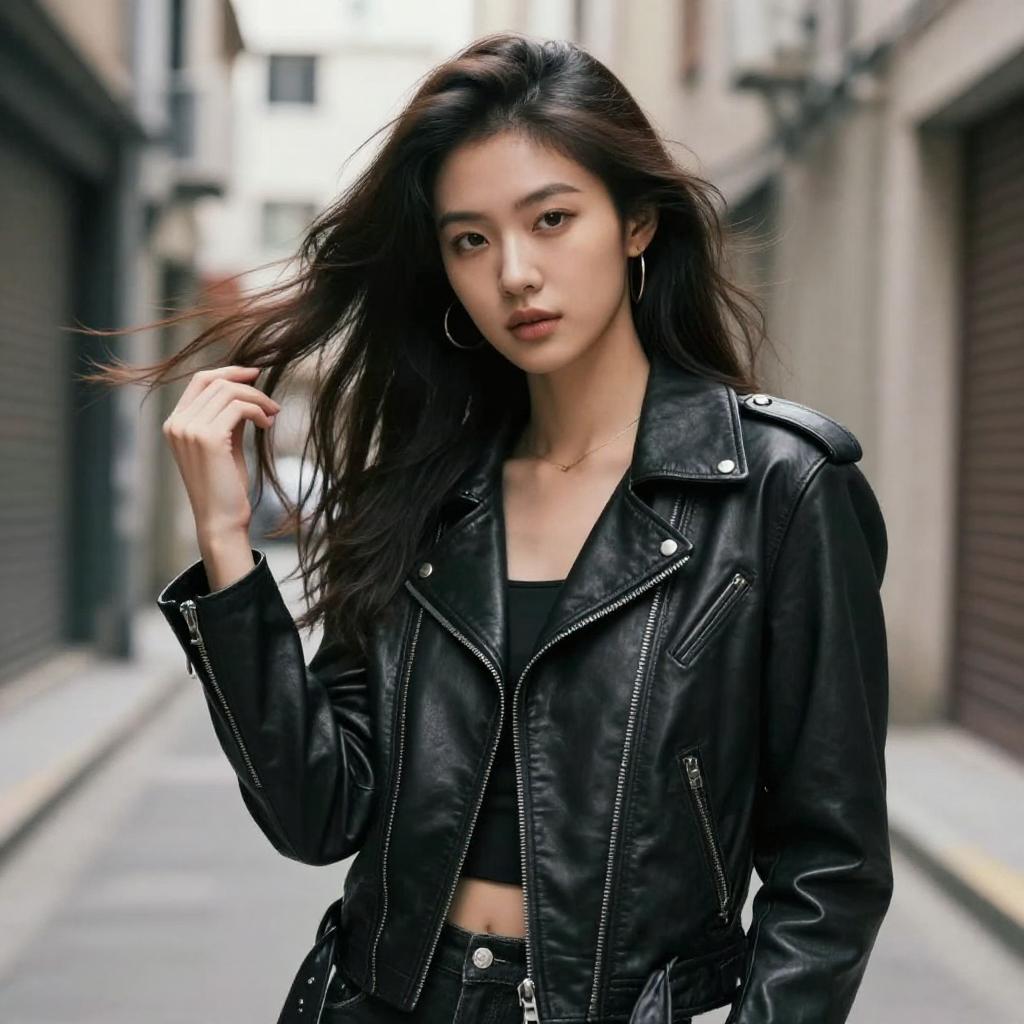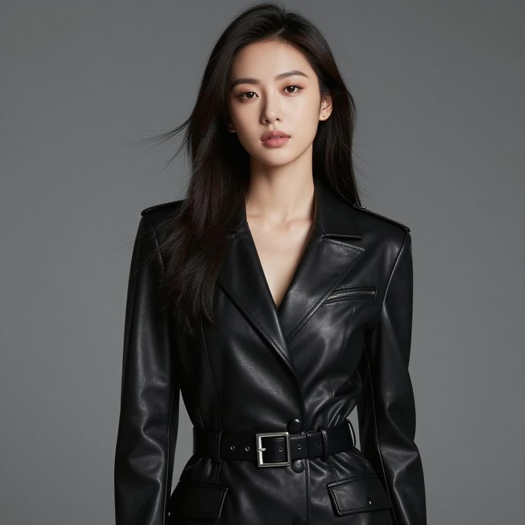 A captivating portrait of a young woman showcasing elegance and confidence. Dressed in a sleek black leather outfit, she exudes a modern and stylish vibe, perfect for fashion and beauty themes.