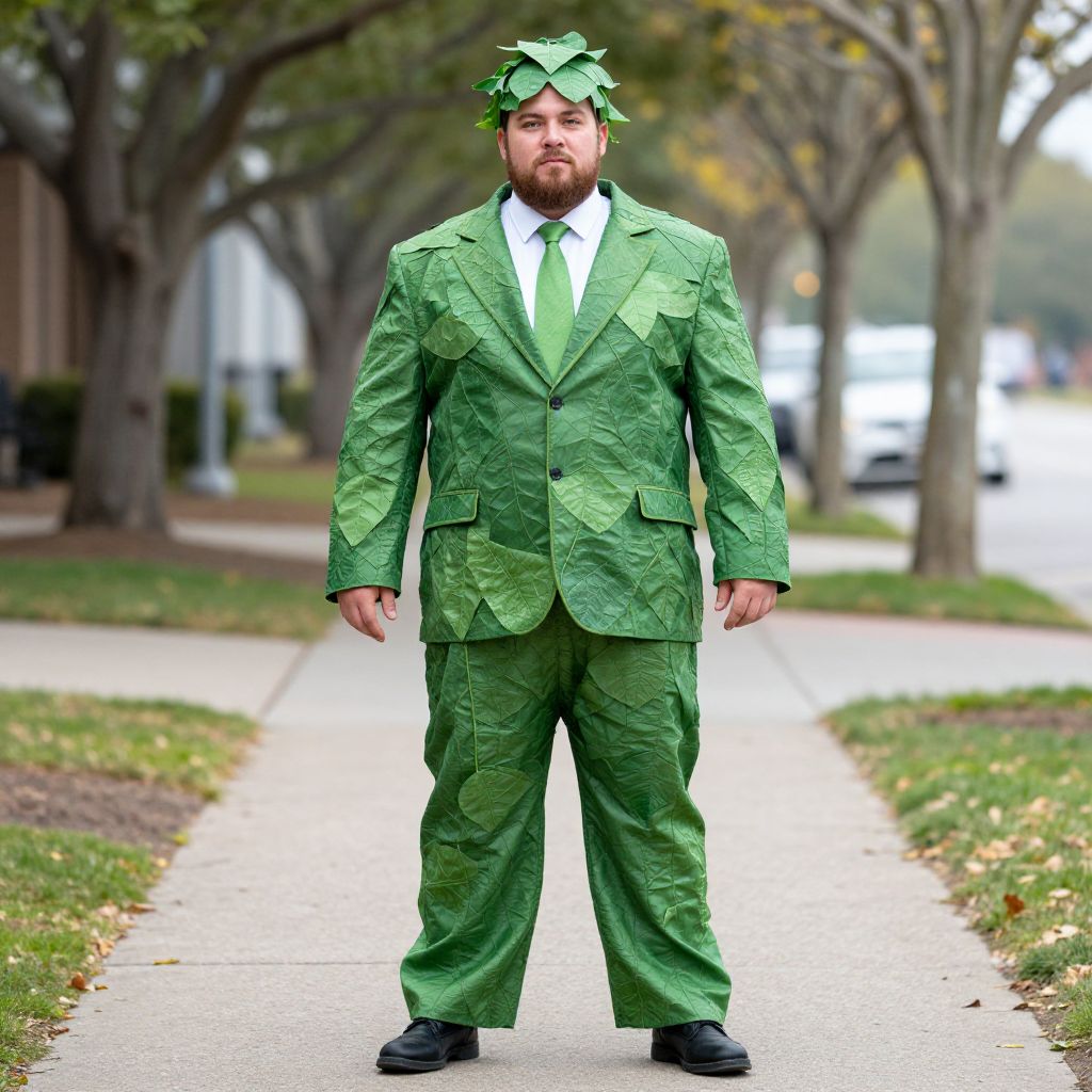 Photograph of a bearded man standing on a suburban sidewalk. He wears a vibrant green suit with a leaf pattern, a white shirt, and a green tie, complemented by a leafy green headpiece. The suit and headpiece have a textured, crumpled appearance. He stands with a neutral expression, facing the camera. The background features a tree-lined street with blurred houses and parked cars. The overcast sky adds a soft, diffused light, enhancing the colors of his outfit. The grass on either side of the sidewalk is adorned with scattered yellow leaves.