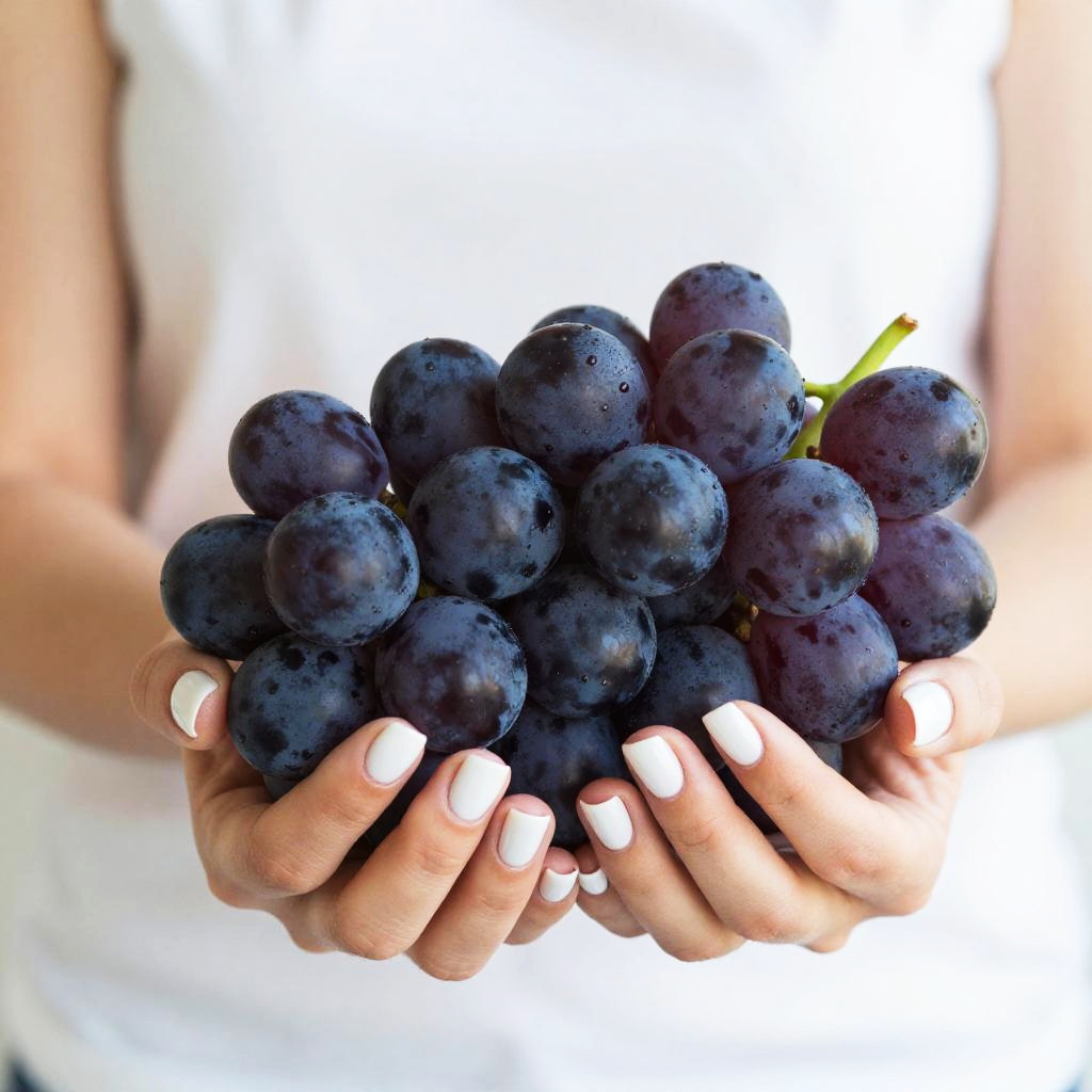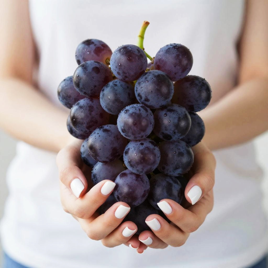 Close-up photograph of a person's light-skinned hands with white manicured nails holding a cluster of dark purple grapes. The person is wearing a sleeveless white top, and the background is bright and out of focus, emphasizing the vibrant grapes and well-groomed hands.