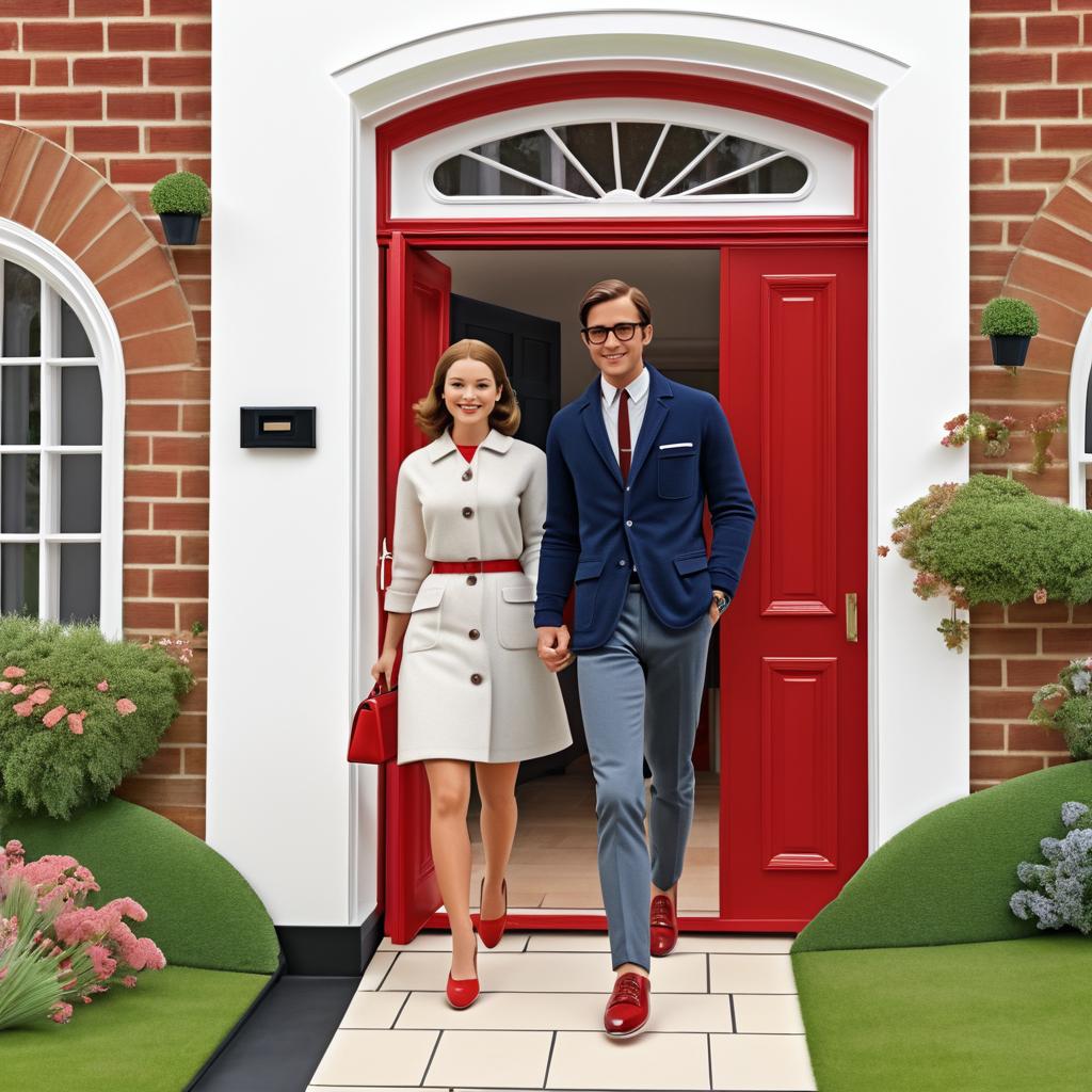 Ink Chemistry a roundel photorealistic digital illustration of an attractive and happy young mixed couple arriving at the entrance to a house, drawn from inside the house, white background, deep red, 1960s, wes anderson,
