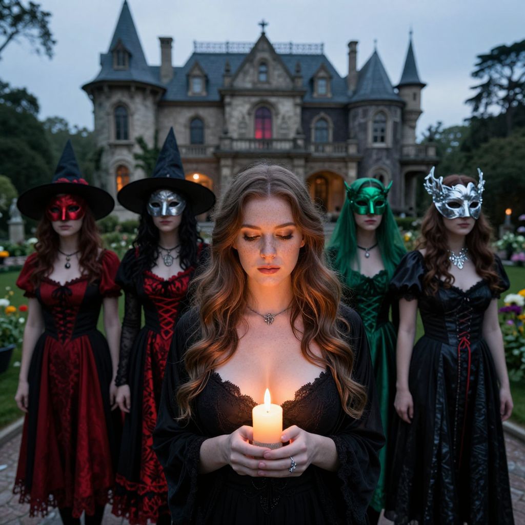 A cinematic wide-angle photograph of a group of women in witch costumes, each wearing unique elements—some with black and crimson outfits, others with forest green and silver masks—standing in a haunted mansion garden at twilight, one woman holds a glowing candle, her face has soft, freckled skin, long wavy hair, and a serene, focused expression. The woman has big tits and cute face