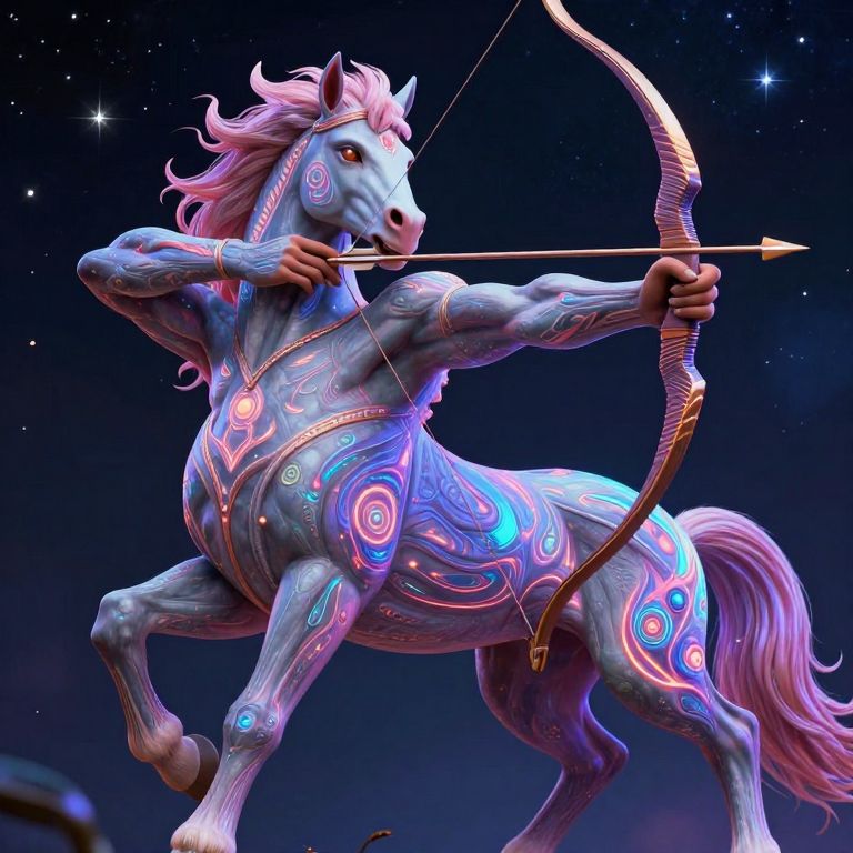 The image depicts a highly detailed and vibrant depiction of a centaur, specifically a Sagittarius, in a dynamic, action-oriented pose. The centaur is muscular and powerful, with long, flowing hair that adds to its majestic appearance. The figure is holding a bow and arrow, ready to shoot, with the arrow nocked and aimed forward. The centaur's body is adorned with intricate, glowing patterns that suggest a connection to mythology and astrology, with a trippy, psychedelic aesthetic. The background is starlit, adding to the celestial and cosmic theme. The overall composition is photo-realistic, with a high level of detail and realism, capturing the essence of the mythological creature in a visually striking manner. The use of neon colors and glowing elements gives the image a futuristic, universal feel, emphasizing the centaur's strength and power.