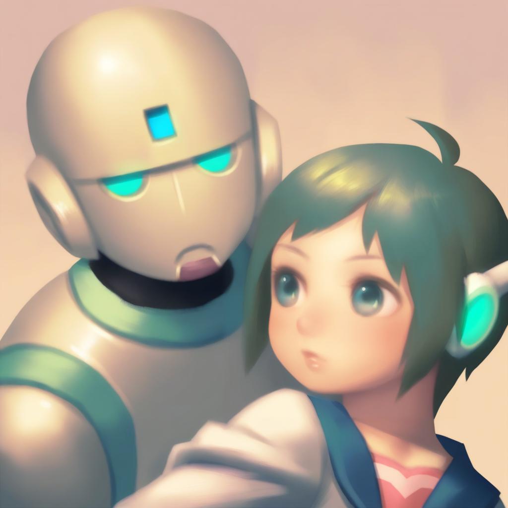 Digital illustration of an anime-style girl with short green hair and green eyes wearing a traditional Japanese school uniform (serafuku) with long sleeves, accompanied by a futuristic robot with glowing blue eyes and a smooth metallic surface. The robot has a square blue light on its forehead and the girl also wears robot-like ear accessories. Soft lighting highlights the characters in a modern, pastel color palette.