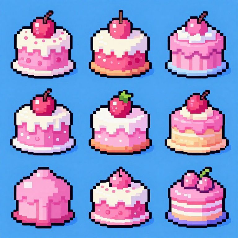 Game asset of cakes and dessert, pixel art references, in gouache detailed paintings, props, stylized, 2 d sprites, kitbash, arcane, overwatch, blue and pink color scheme, 8 k, close up