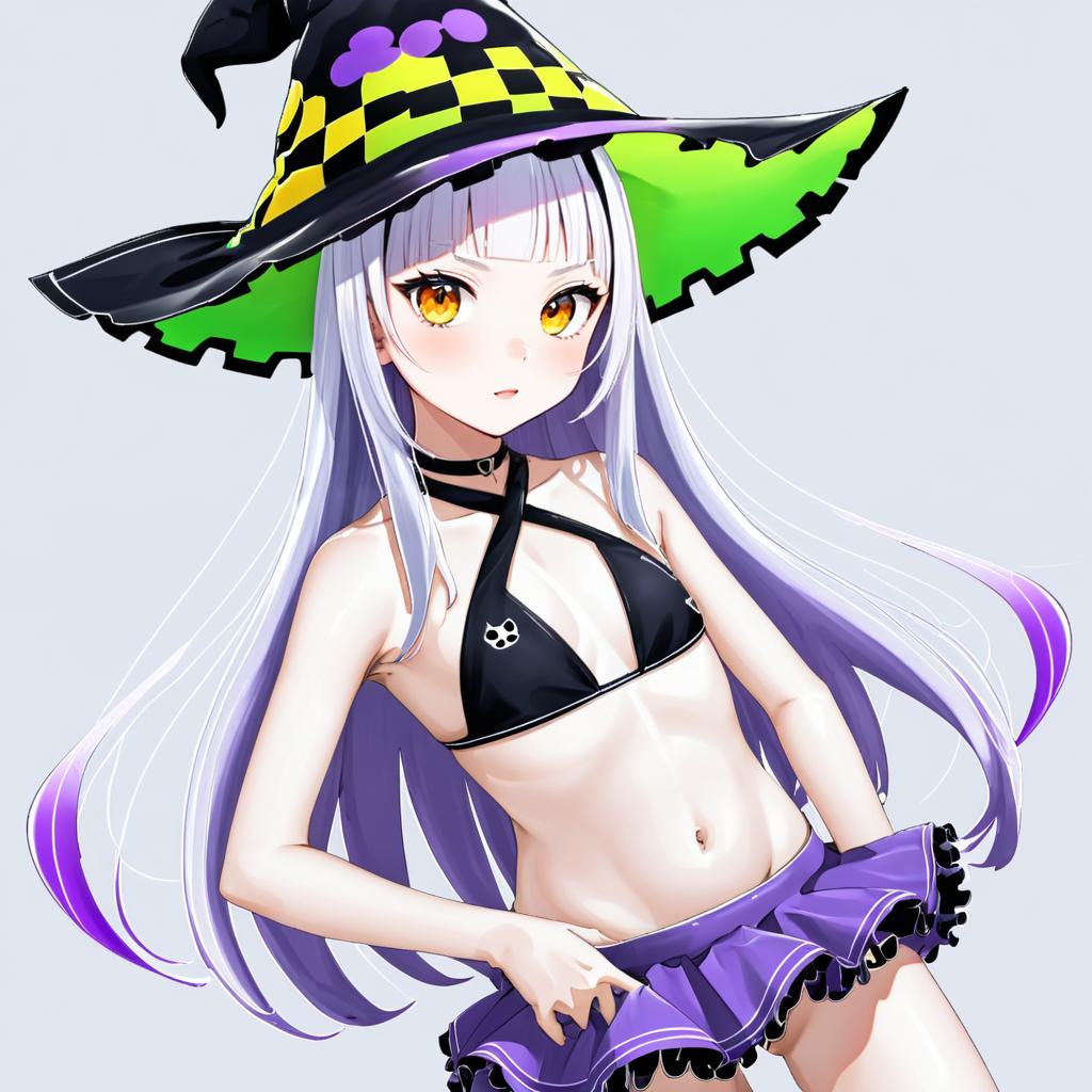 This digital anime-style drawing features a young girl with long, straight, white hair with purple tips. She has yellow eyes and wears a large, black witch hat with a green brim and yellow checkered pattern. Her outfit includes a black bikini top with an anchor symbol and a purple, frilled mini-skirt. She has a pale skin tone and a slim, youthful physique. The background is plain white, making her vibrant colors stand out. Her expression is neutral, and she holds the edge of her skirt slightly, adding a playful touch to the image.