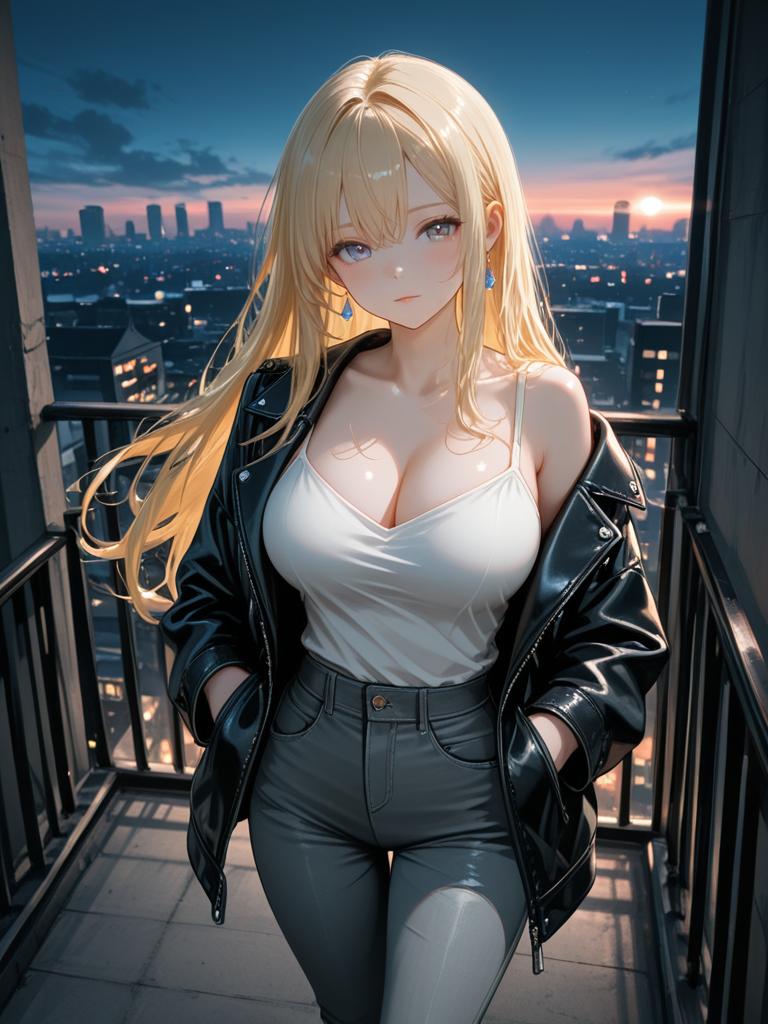 (masterpiece, best quality), 1girl, (oversized leather jacket), navel, thick thighs, shorts, ((intricate, leaning against the wall, dappled sunlight, poster)), long hair, upper body, wavy hair, blonde, hand in pocket, head tilt, wide hips
