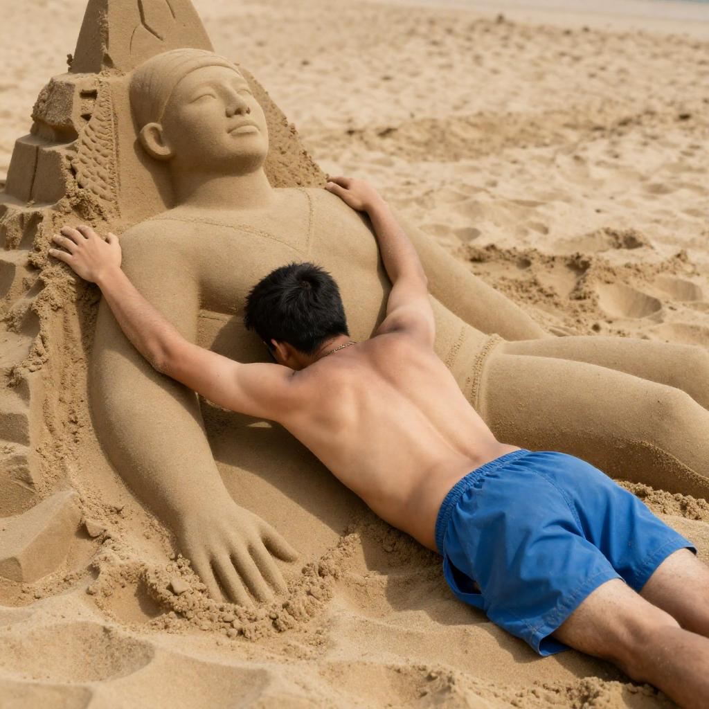 Shirtless man with blue shorts lying on sand, embracing large sand sculpture of reclining figure. Sunlight casts shadows. Sand has ured patterns. Man's back to camera, face not visible. Beach setting, warm light.