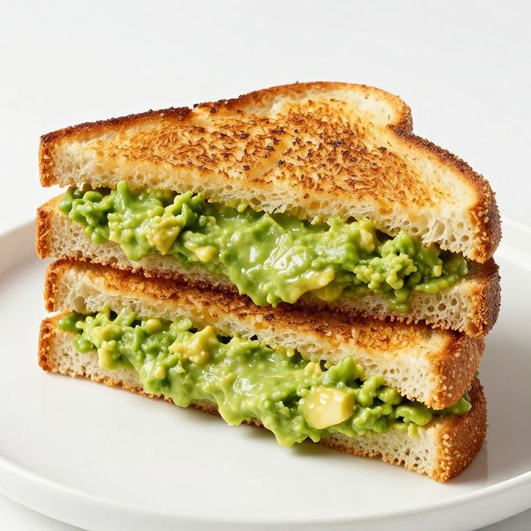 Golden-brown grilled cheese sandwich halves stacked atop each other, showcasing vibrant green guacamole oozing between toasted bread, served on a pristine white plate.
