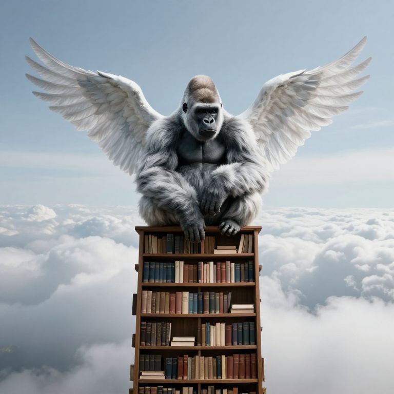 Suspended between earth and sky, a silverback gorilla with ethereal wings sits serenely atop a towering bookshelf, embodying the transcendence of knowledge and the quiet power of introspection amidst the boundless expanse of clouds.