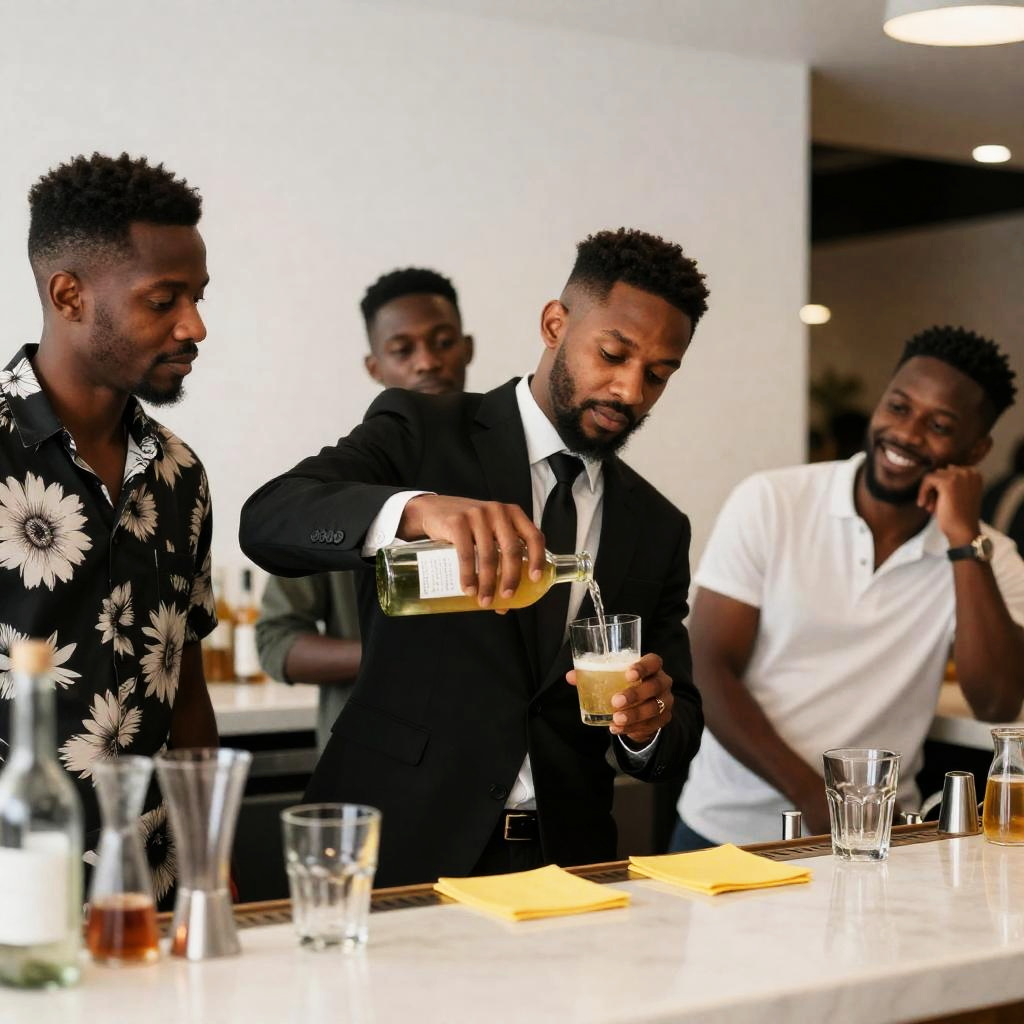Four Black men at a modern bar. The central man, dressed in a black suit and tie, is pouring a drink from a bottle into a glass. Another man on the left wears a black shirt with white floral patterns, attentively watching. A third man in a white polo shirt smiles, leaning on the bar counter. The scene features a marble bar top with glassware, yellow napkins, and soft ambient lighting.